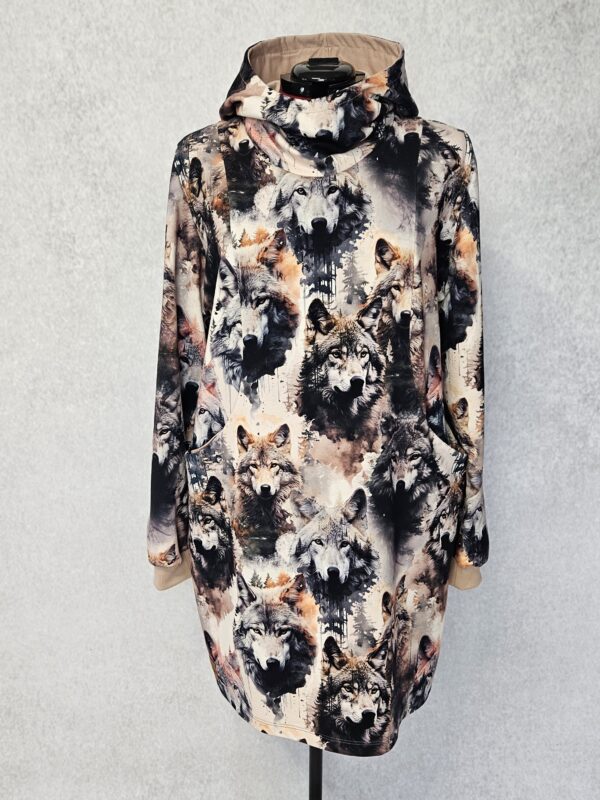 Model stworzony z myślą o karmiących mamach, w ozdobnych cięciach na przodzie sukienki wszyte są zamki kryte, dekolt okrągły lub wykończony obszernym kapturem ze stójką, w szwach na przodzie kieszenie.