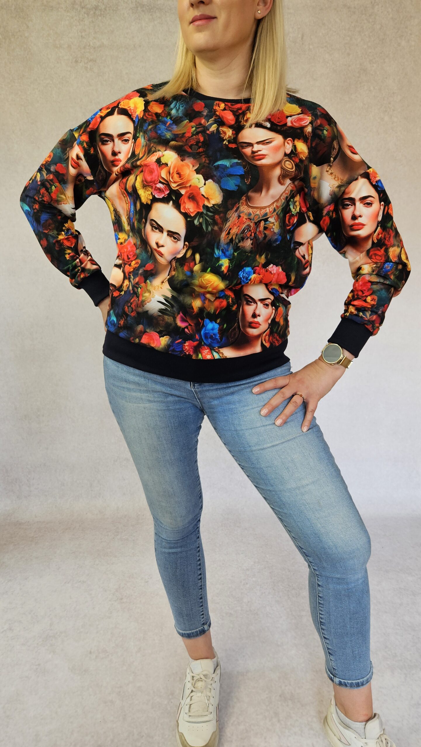 Bluza damska w rozmiarze S. Krój oversizowy, obniżona linia ramienia. Rękaw kimonowy, dekolt okrągły. Dół, rękawy i dekolt wykończony ściągaczem.