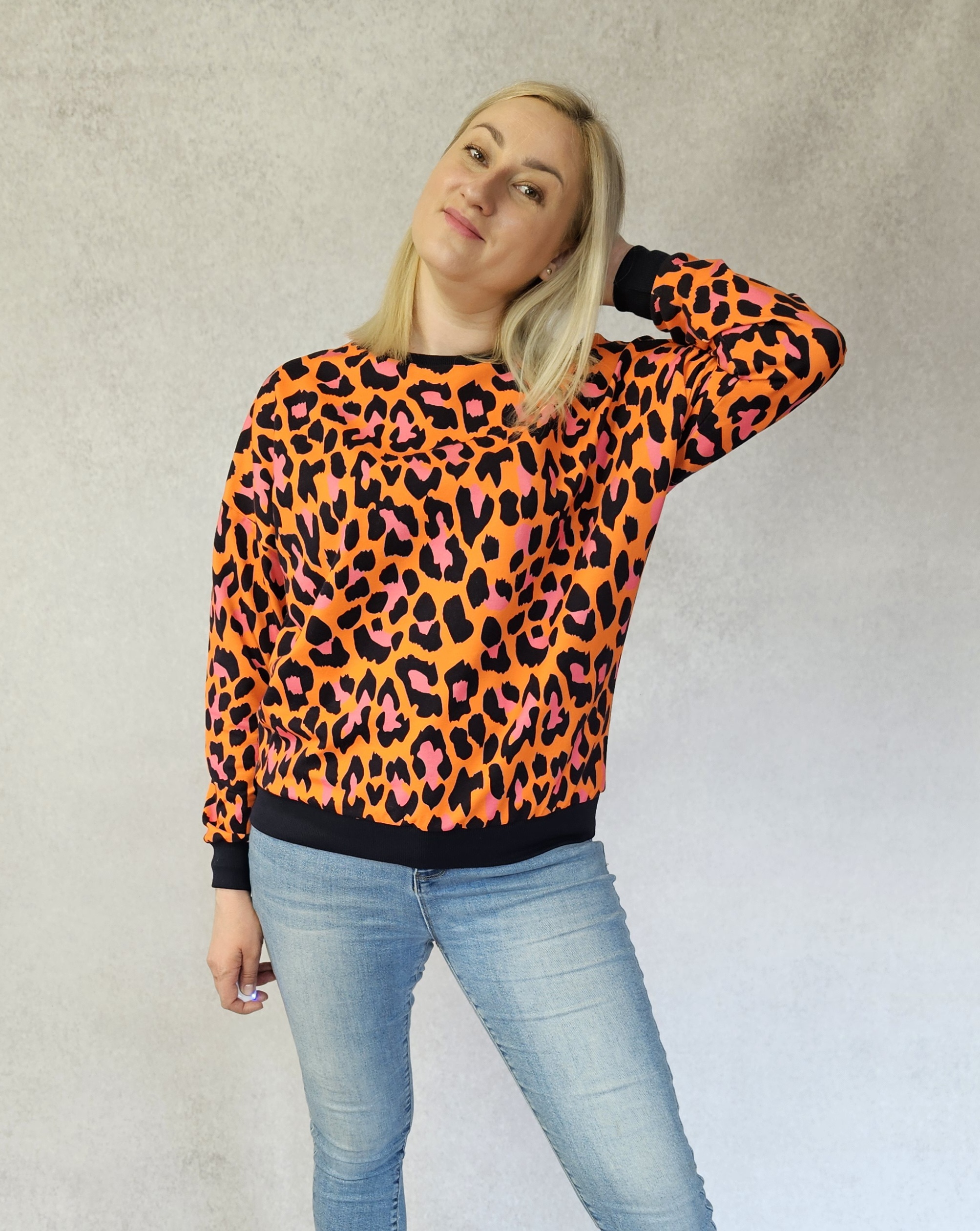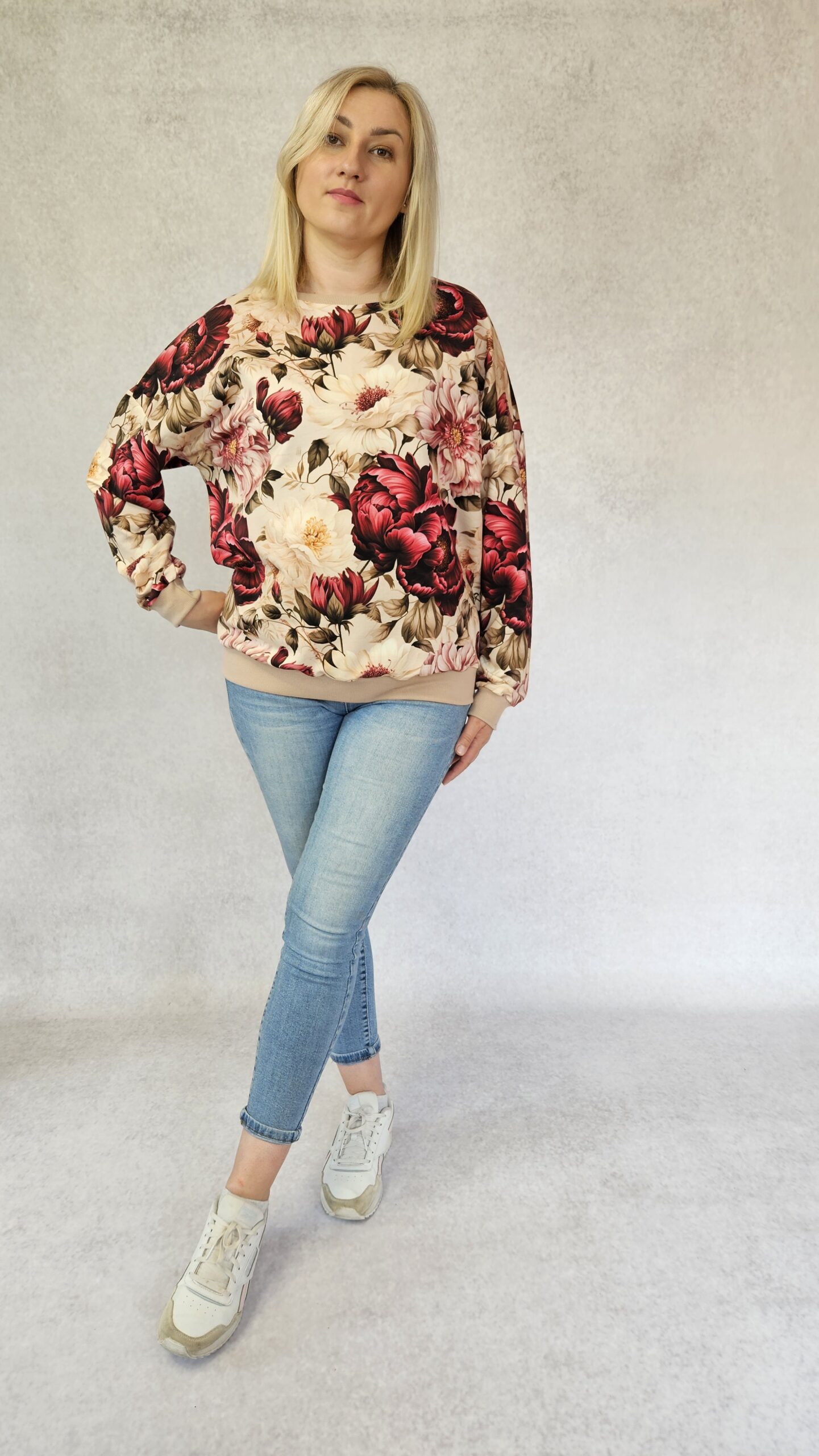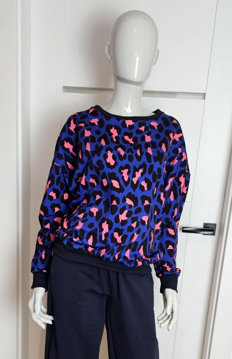 Bluza damska o oversizowym kroju, obniżona linia ramienia. Rękaw kimonowy, dekolt okrągły. Dół, rękawy i dekolt wykończony ściągaczem.