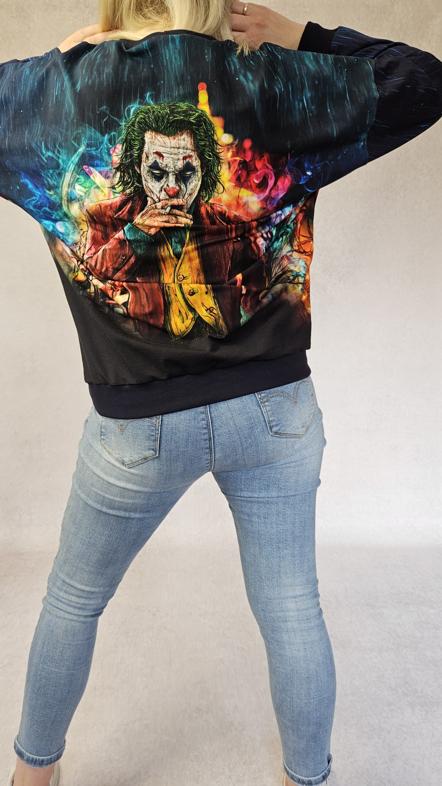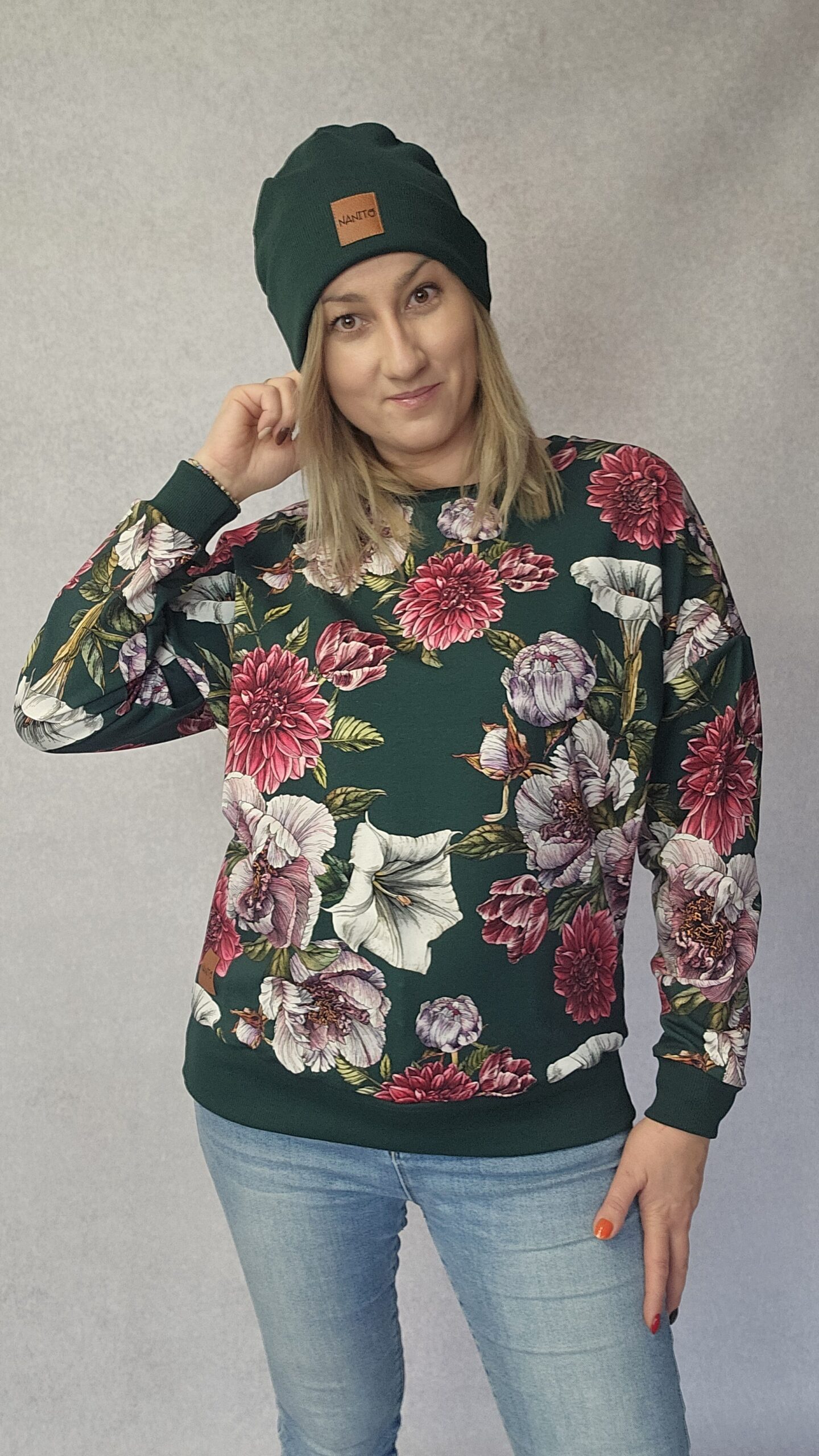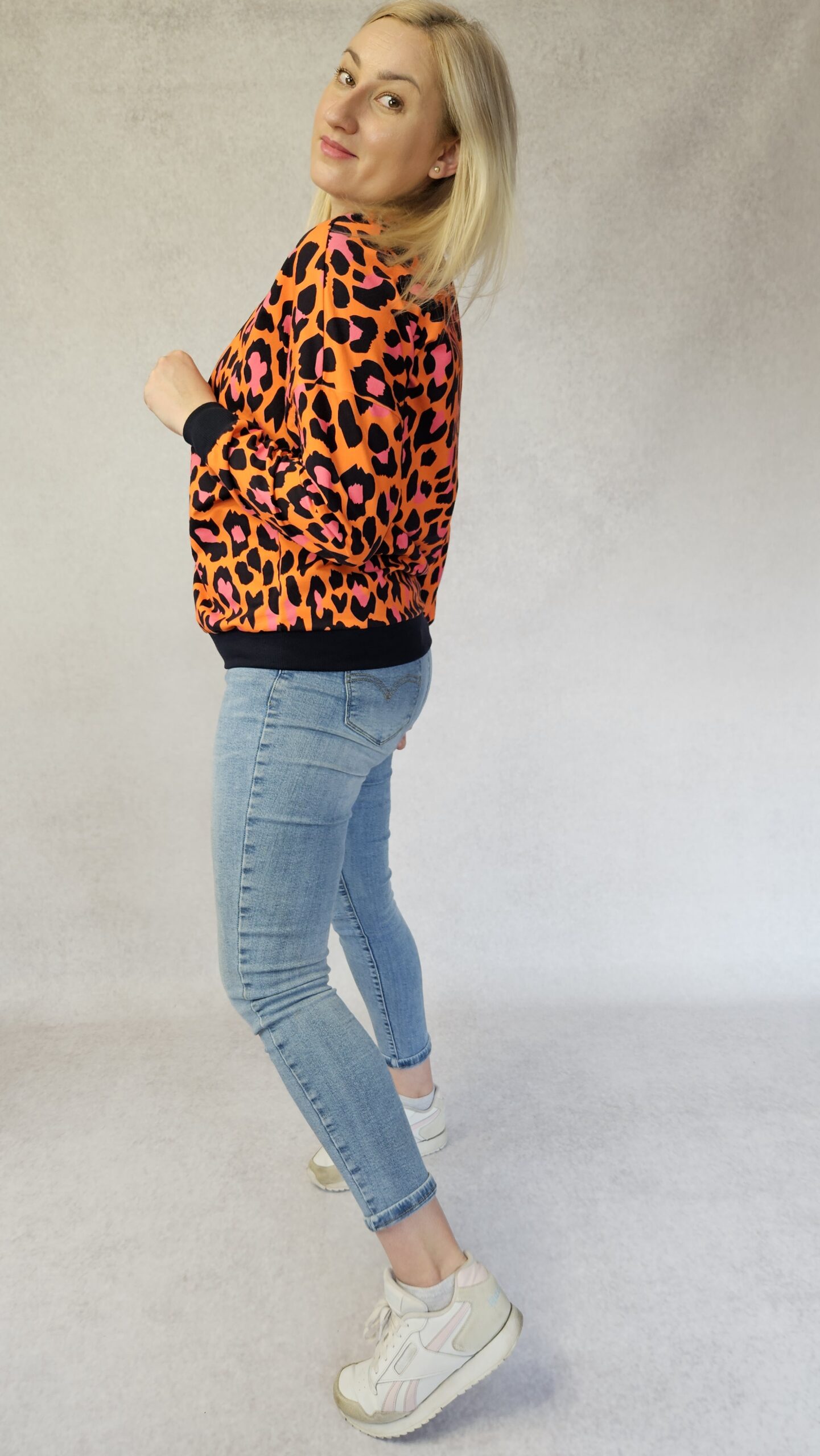 Bluza damska o oversizowym kroju, obniżona linia ramienia. Rękaw kimonowy, dekolt okrągły. Dół, rękawy i dekolt wykończony ściągaczem.