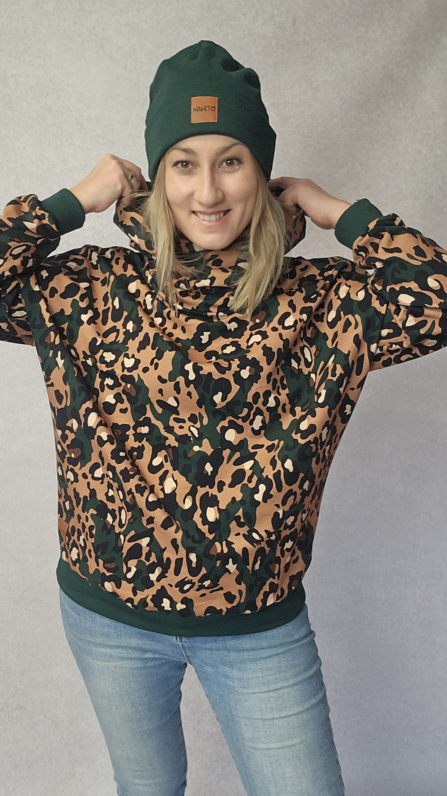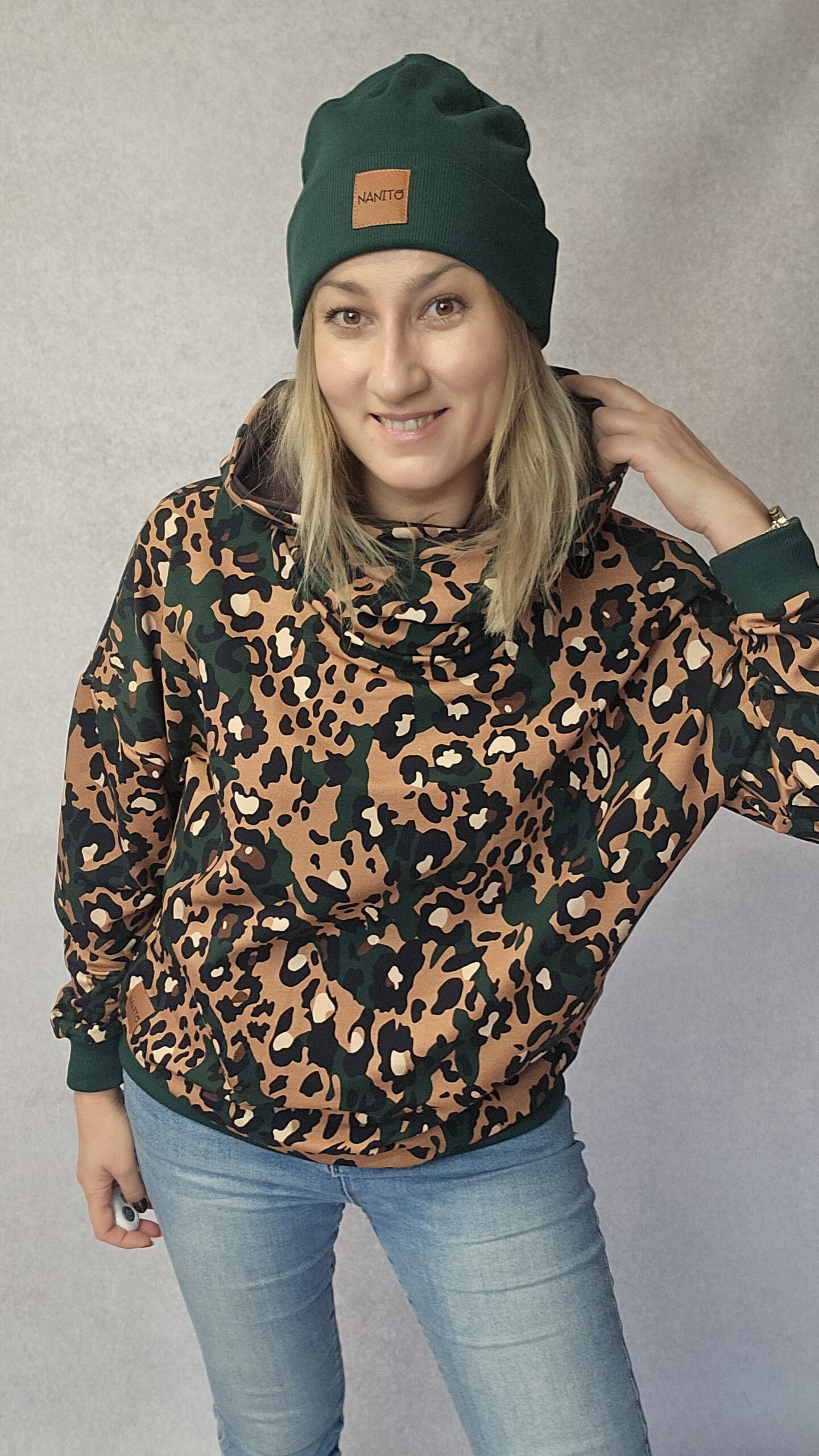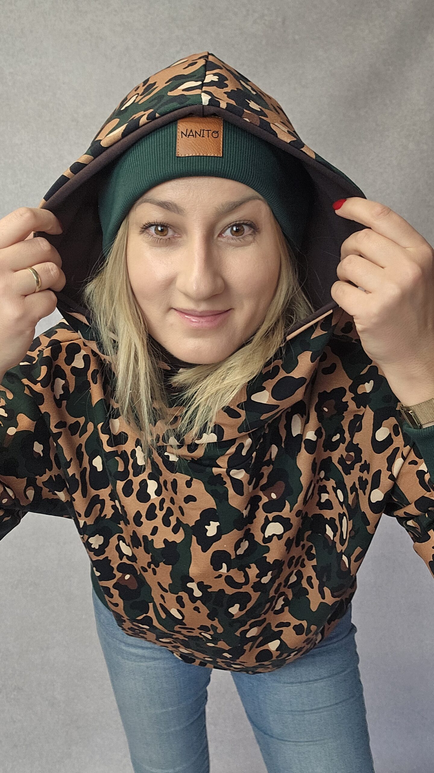 Swobodny krój, obniżona linia ramienia, i zachodzący na siebie kaptur, to cechy charakterystyczne tej bluzy. Rozmiar oversizowy M. skład materiału dresówka pętelka, 95% bawełna, 5% elastan.