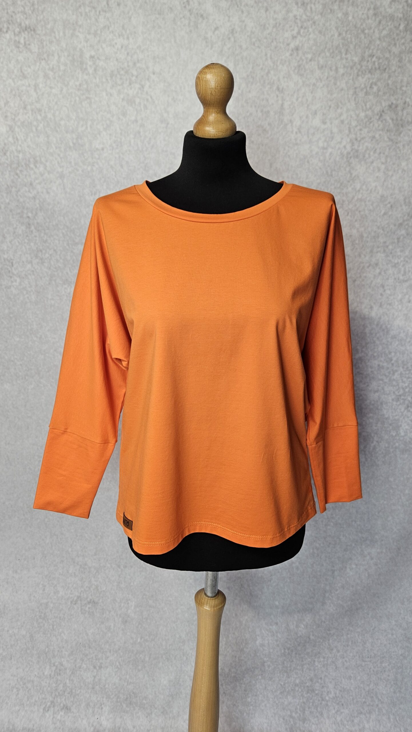 Krój kimonowy, swobodna góra, dekolt okrągły, rękaw 3/4.