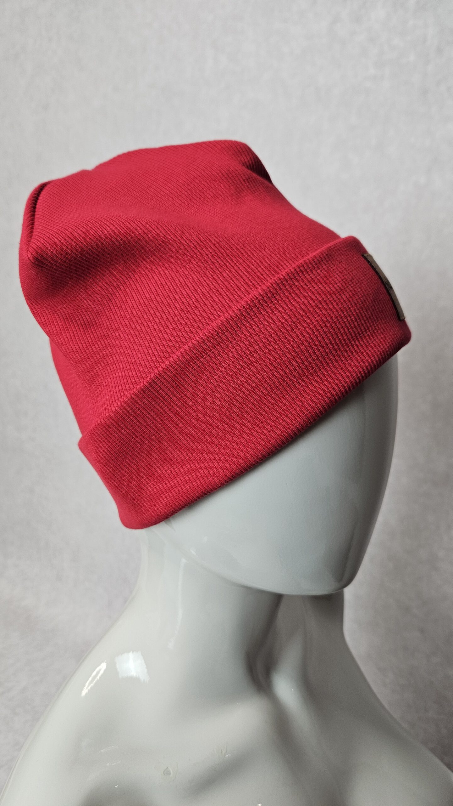 Czapka wywijana typu beanie. Uszyta z dzianiny prążek, miękkiej i przyjemnej w dotyku.