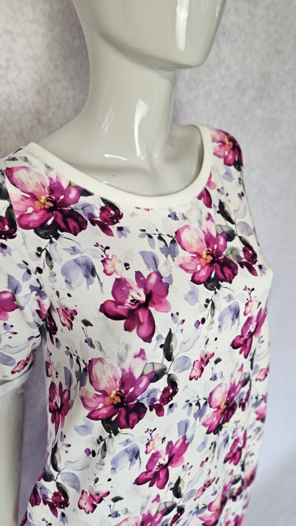 Sukienka z dzianiny jersey. Górna część sukienki dopasowana na wysokości biustu, od biustu swobodna, zwężająca się ku dołowi.  Długość midi, dekolt okrągły, rękaw krótki, wywijany, w szwach bocznych kieszenie, dół w kształcie bombki.