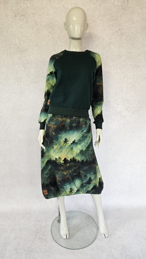 Spódnica w długość midi, krój sportowy, w dole zmarszczona gumką, skośne kieszenie w przodzie. Szyta z dresówki pętelki. Skład materiału 95% bawełna, 5% elastan.