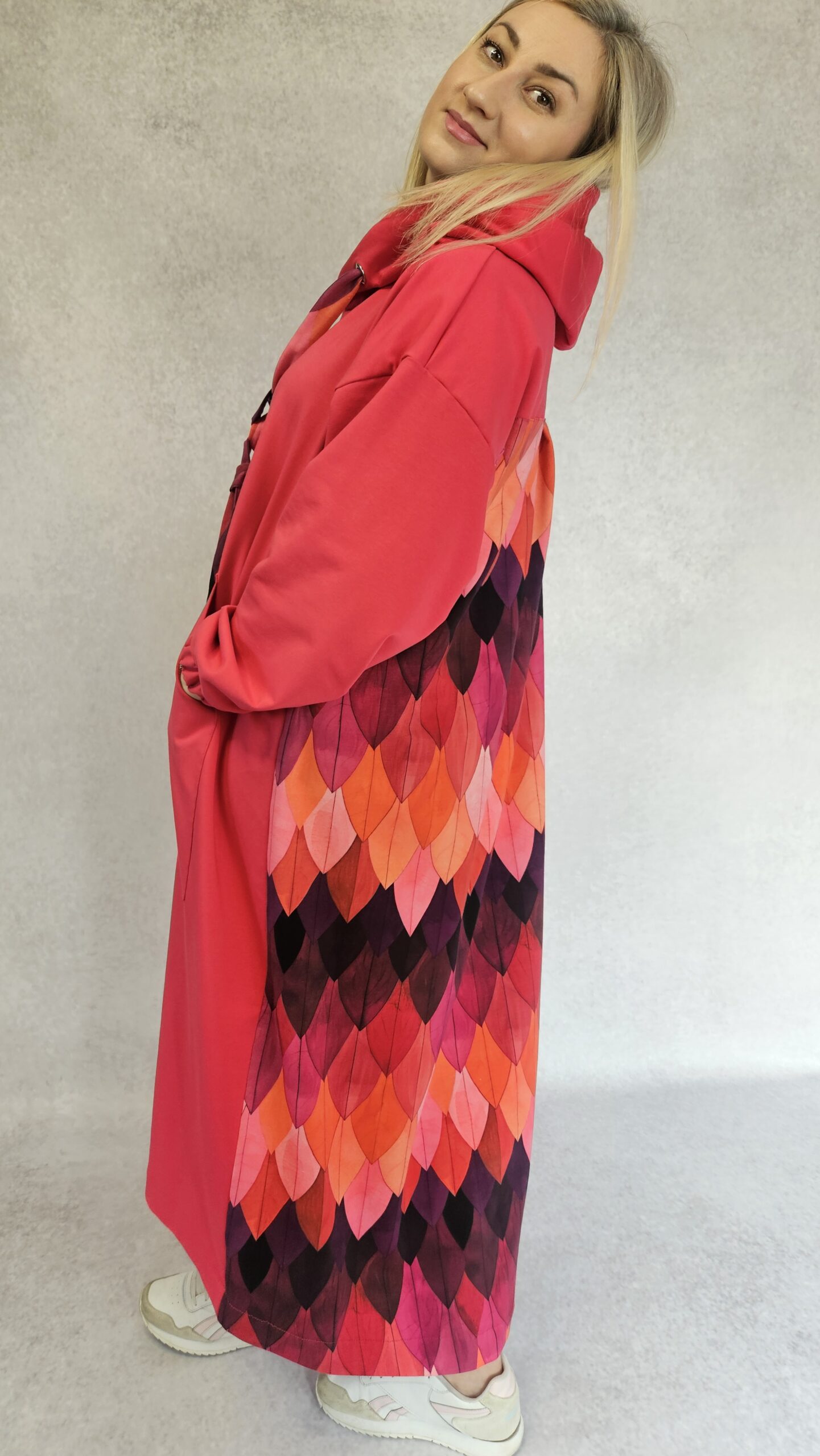 Oversizowa sukienka o fasonie przedłużonej bluzy, szyta z dresówki pętelki, przód i rękawy z jednolitego koloru, tył z wybranym printem czynią ten model wyjątkowym, rękawy mają obniżoną linię ramienia, dekolt wykończony obszernym kapturem, w przodzie duża kieszeń kangurka, na plecach kontrafałda dodatkowo dodająca objętości temu fasonowi.