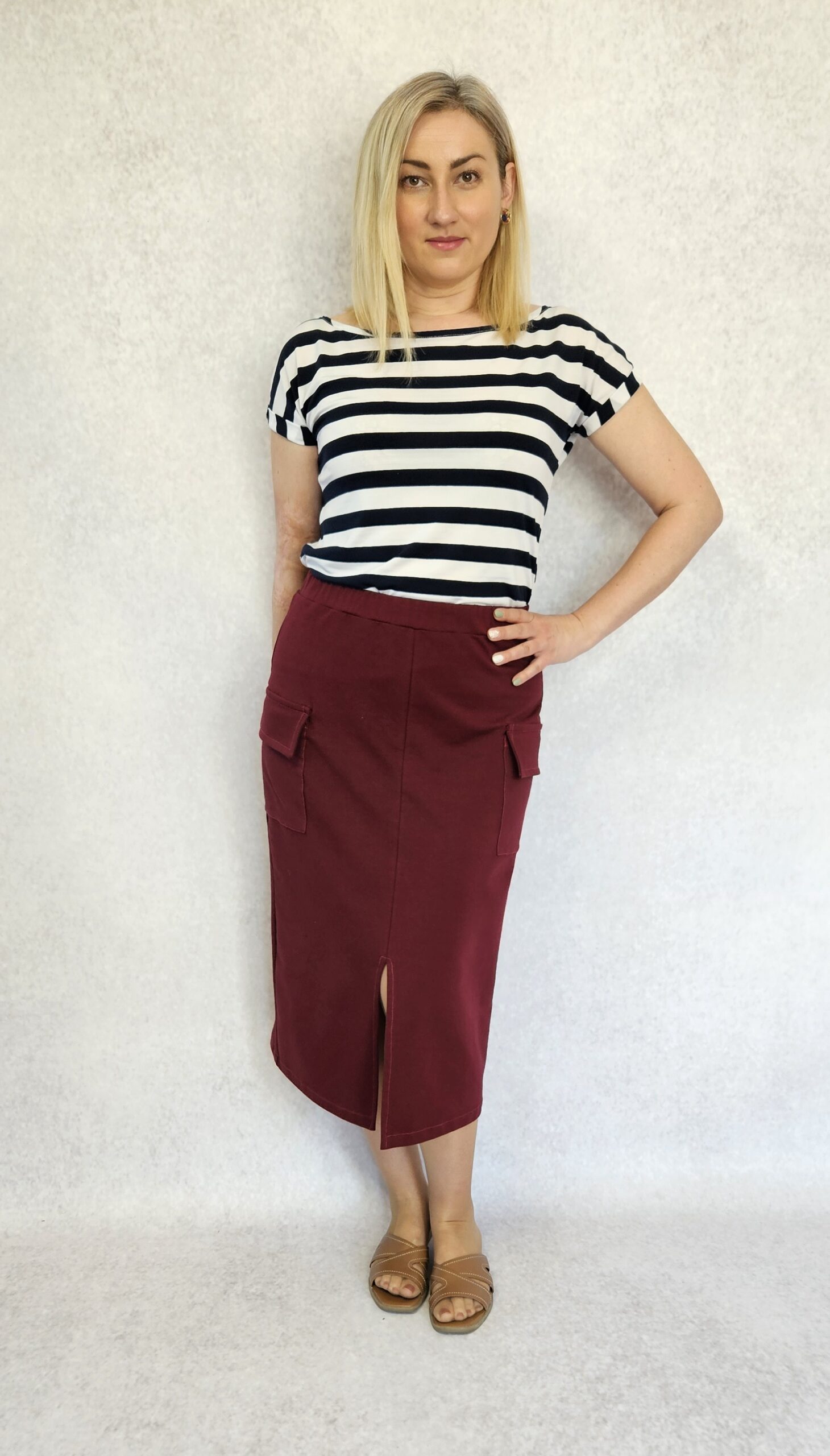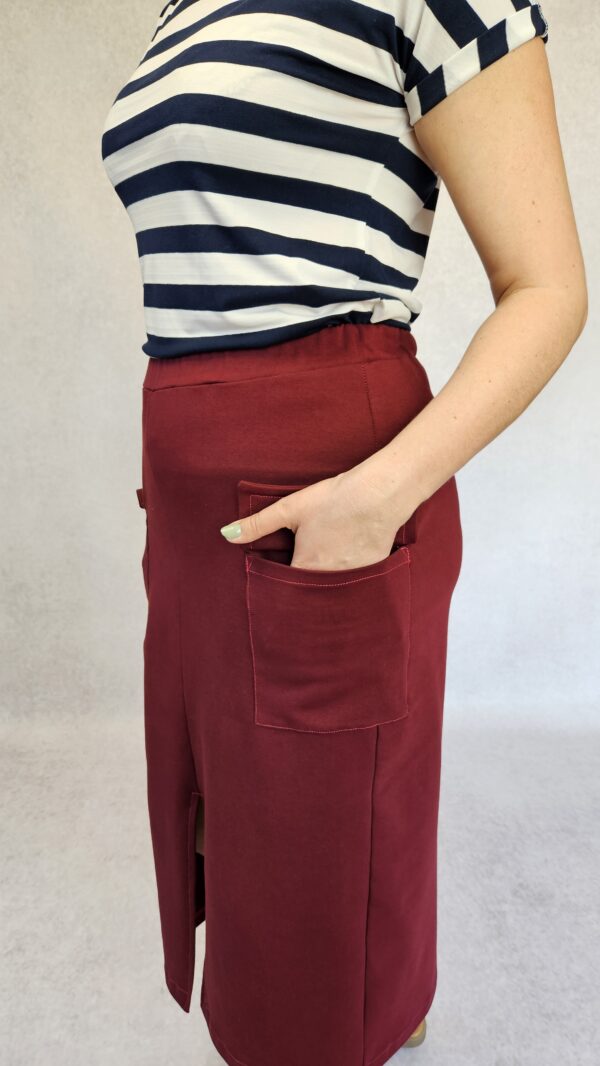 Spódnica o prostym kroju, długość 7/8, w przodzie wysokie pęknięcie, na bokach naszywane kieszenie z patką. Szyta z dresówki pętelki, skład materiału 95% bawełna, 5% elastan.