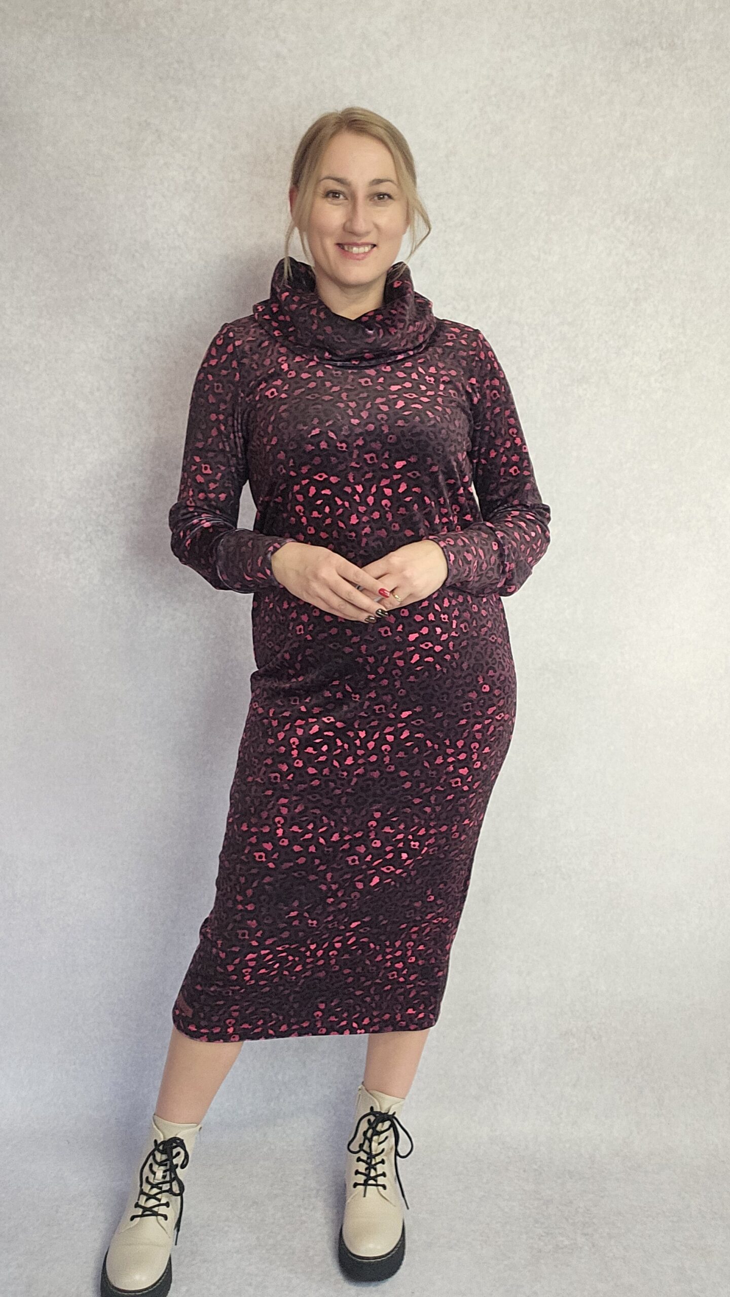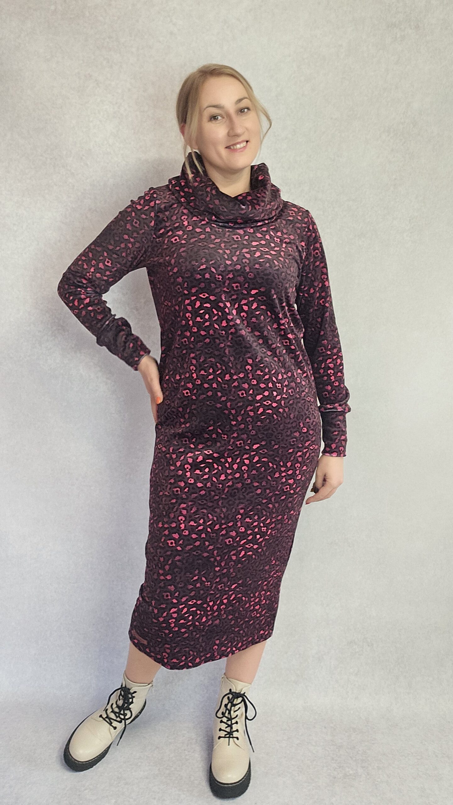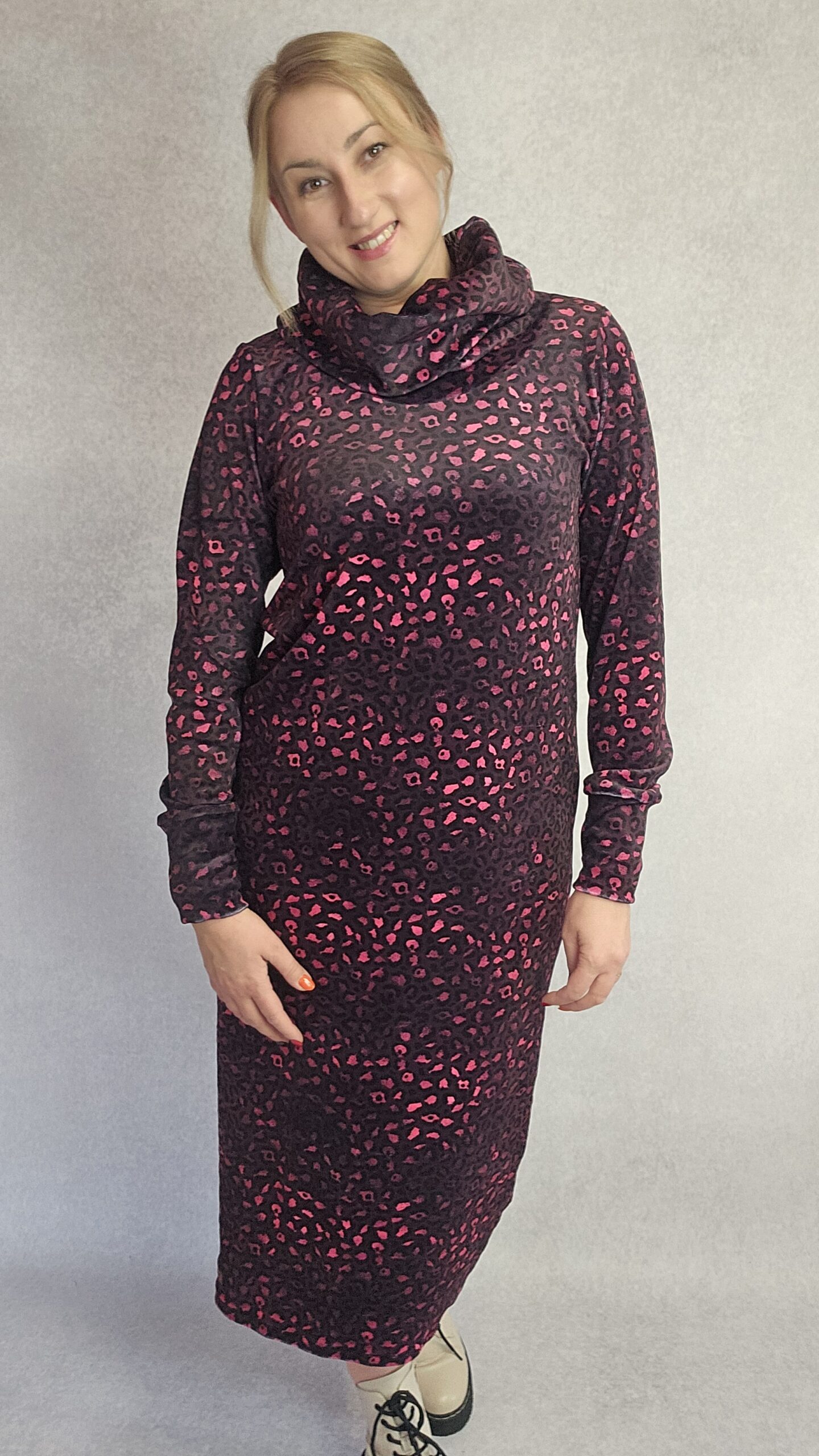 Sukienka która przykuje niejedno spojrzenie a ponadto przyjemnie otuli cię w chłodny dzień. Uszyta z dzianiny welur super soft, niesamowicie miła w dotyku. Krój prosty. Rękaw wykończony szerszym ściągaczem. będzie pasować na rozmiar L-XL, materiał mocno elastyczny.